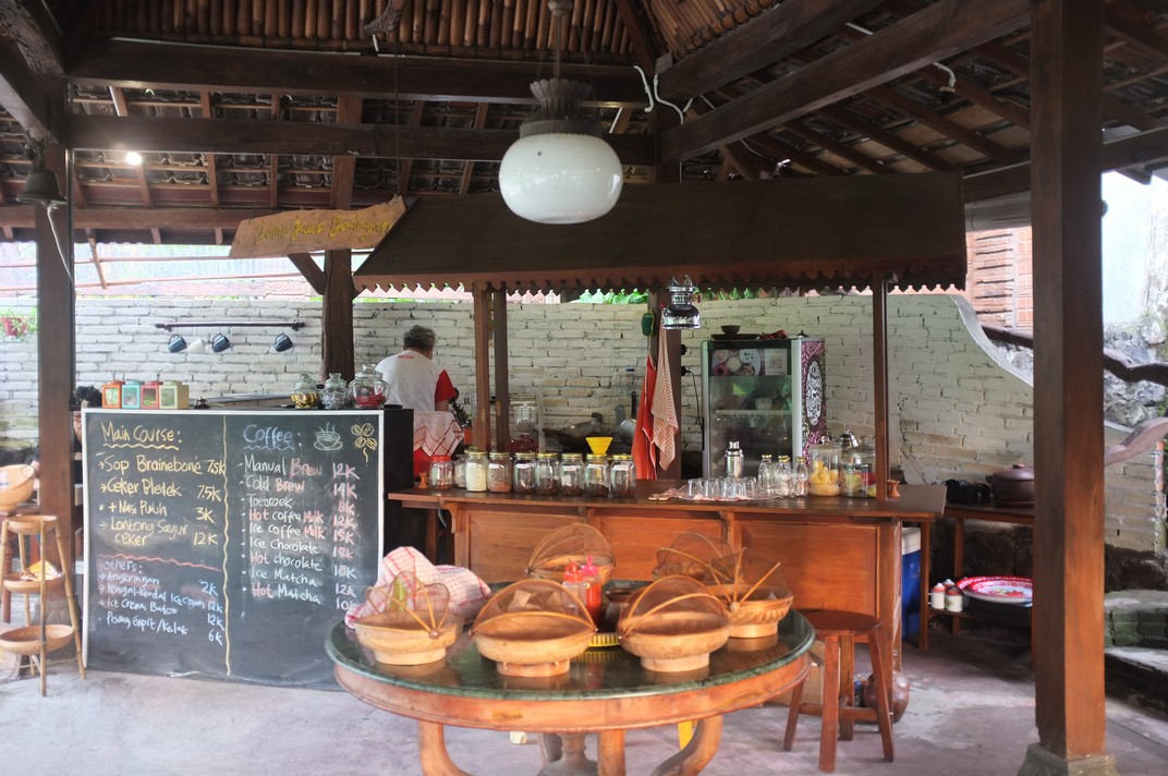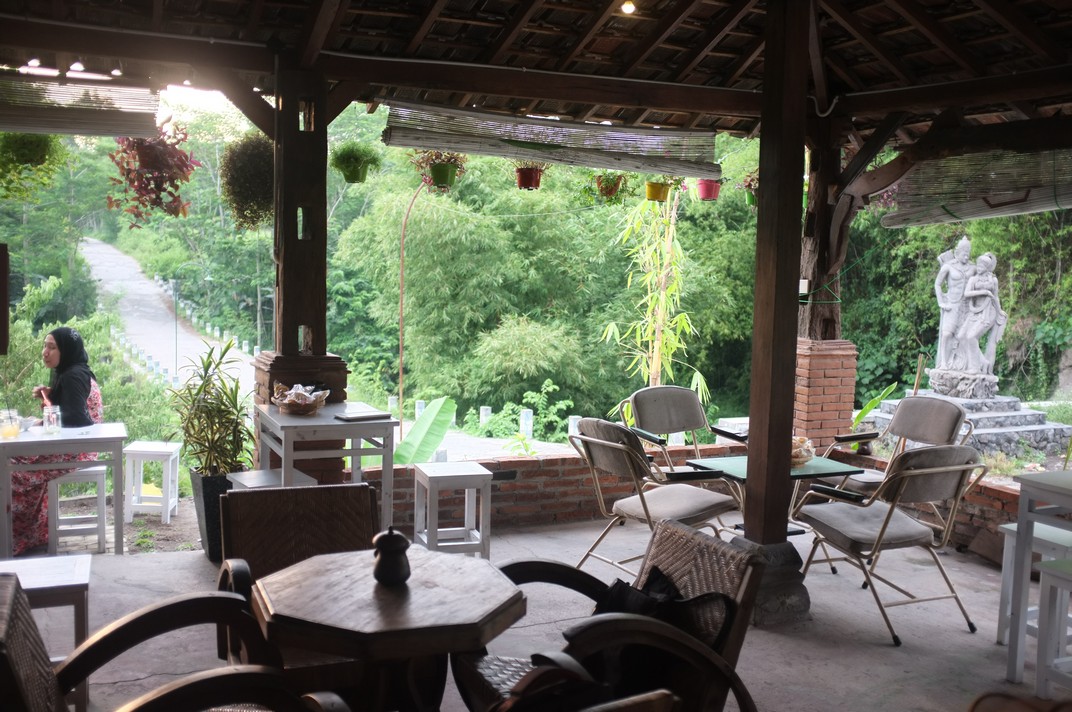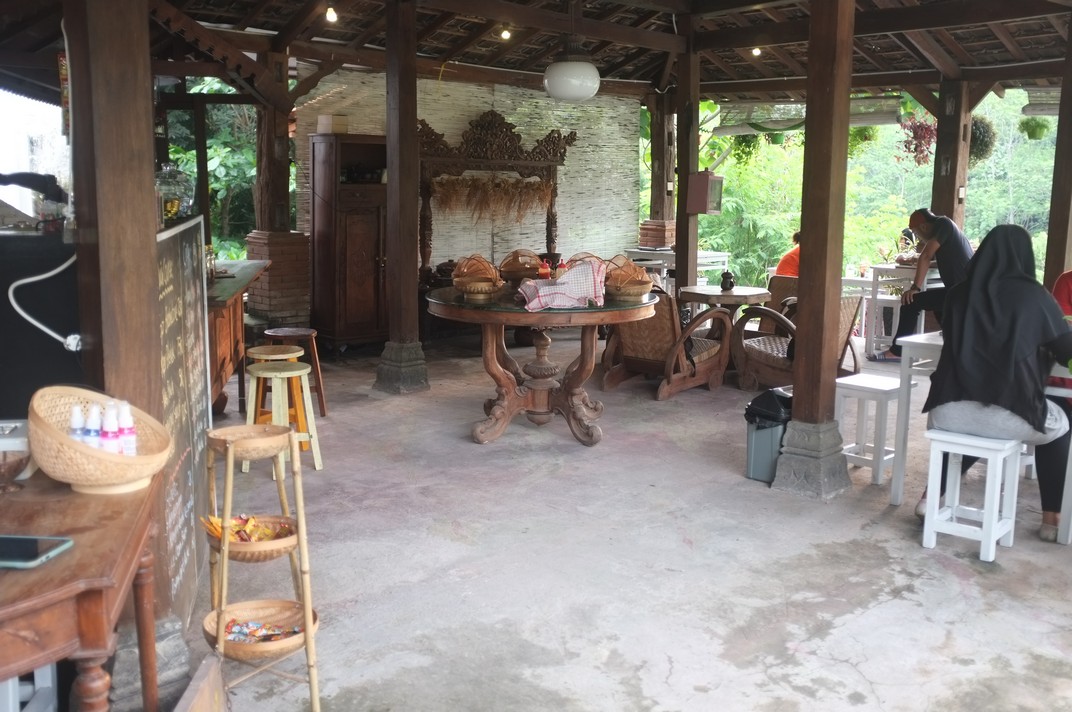 Tempat nya hanya berupa joglo di tepi sungai dilengkapi dengan kursi kursi yang beraneka ragam beralaskan semen cor biasa tanpa keramik.